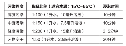 按以下比例稀釋配制清洗液、浸泡清洗物品。